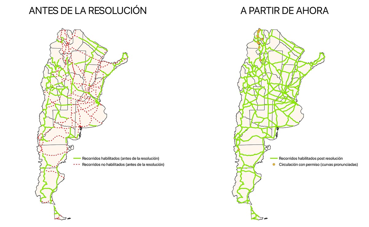 Hasta ahora, los bitrenes de mayor porte solo podían circular por tramos muy específicos, inconexos y que cubrían apenas un tercio del total de las rutas nacionales. Con la normativa anterior, un bitren de más de 25,5 metros que saliera de Buenos Aires no podía llegar a 13 de las 23 provincias. Además, se pedía un permiso para circular que demoraba meses en aprobarse.