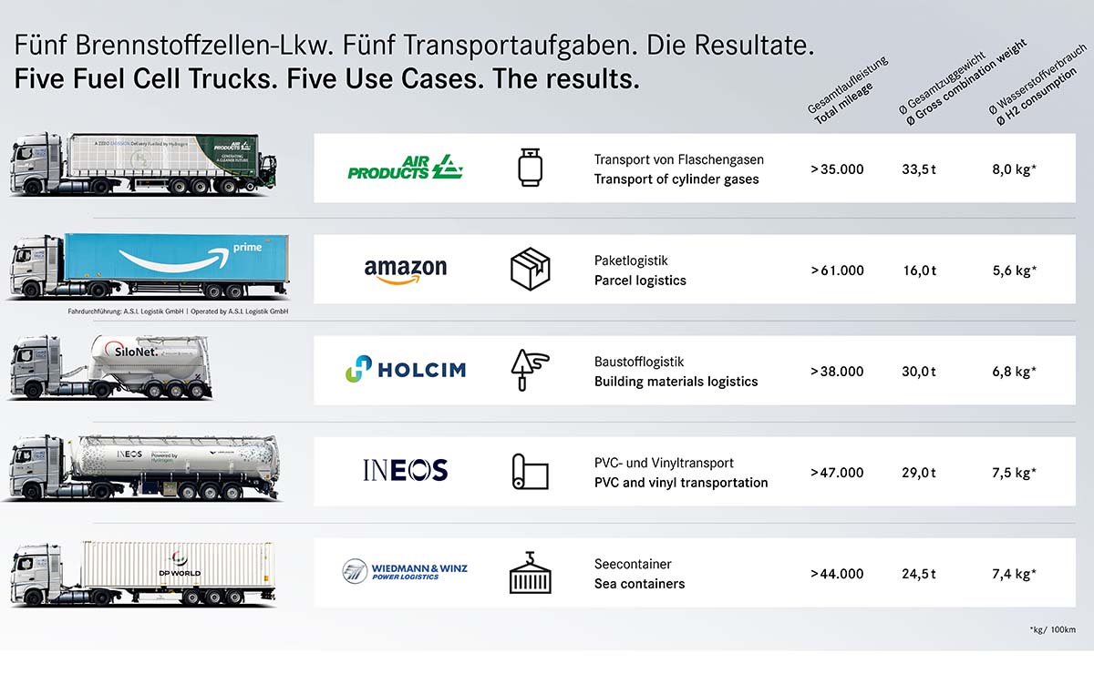 Por ejemplo, Amazon utilizó el camión de la red logística de Amazon en una ruta específica entre el centro de distribución en Frankenthal y la estación de entrega en Sindelfingen. Air Products utilizó el camión a hidrógeno para transportar gases envasados desde su planta embotelladora en Hattingen, en el río Ruhr, y abasteció a gasolineras y clientes allí.