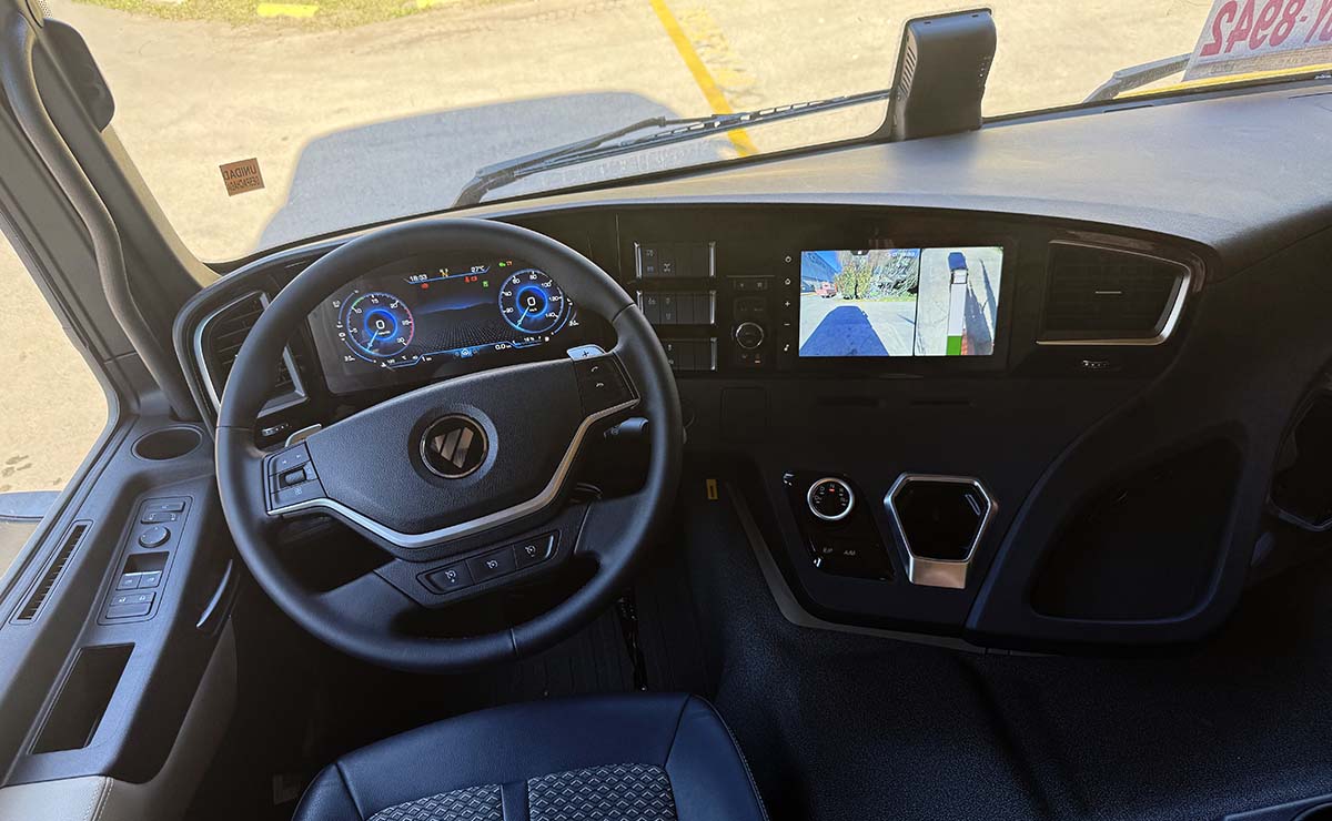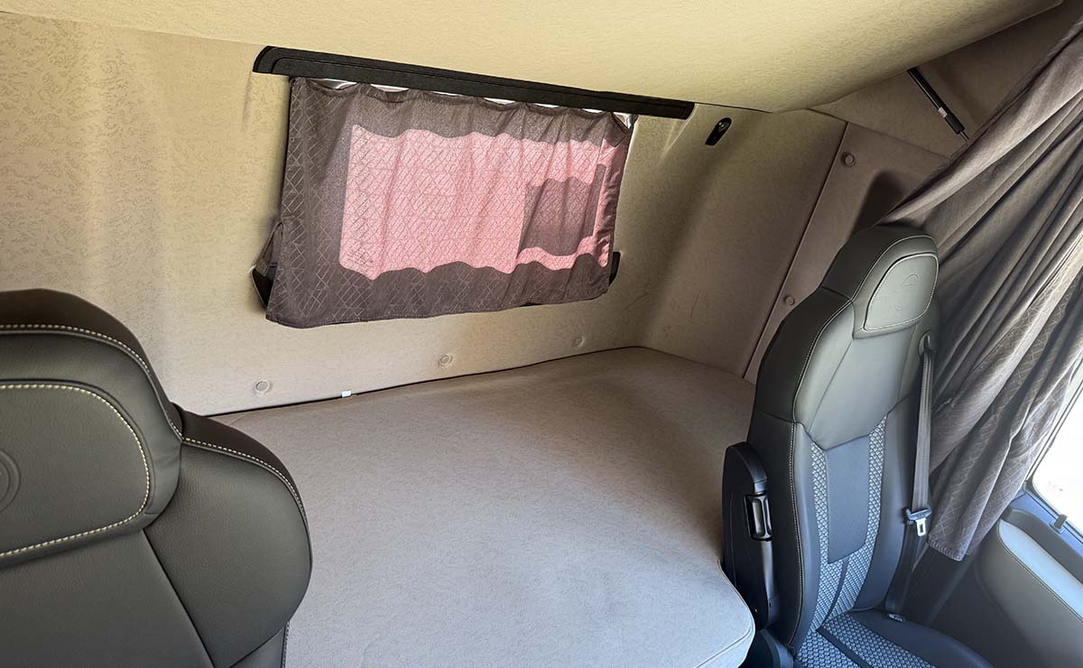 Además de literas de mayores dimensiones, la ventana trasera (con cortina) y la mesita plegable en el lado acompañante, vale mencionar la nueva butaca principal neumática Premium tapizada en eco cuero con funciones de ventilación y calefacción para el conductor que elevan la posición de manejo, así como un volante con los comandos necesarios bien distribuidos y la inclusión de un ítem nunca antes visto en un camión: levas de cambio al volante.