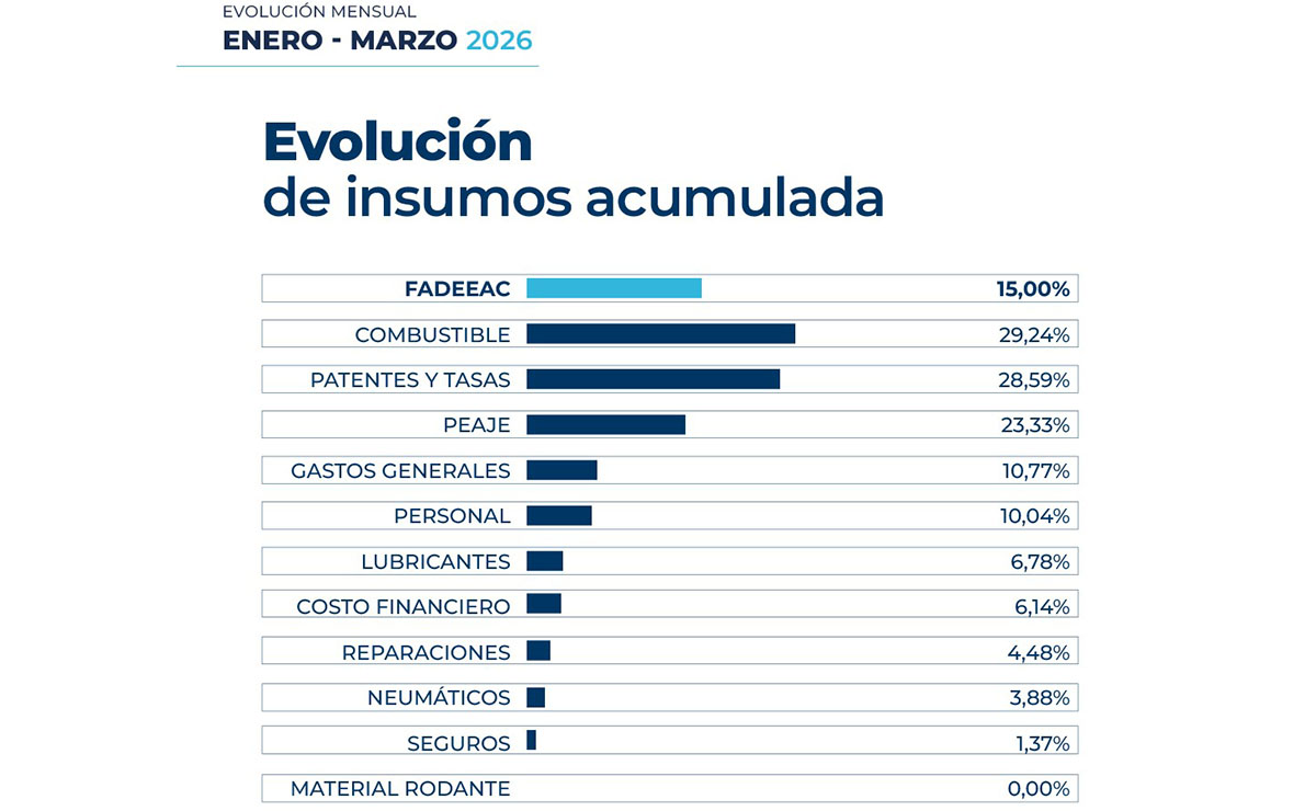 También se registraron incrementos en Lubricantes (3,67%), Neumáticos (2,13%), y Costo financiero (6,46%), mientras que el resto de los rubros (Material Rodante; Seguros; Patentes y tasas, con variaciones anuales) no mostró modificaciones respecto de febrero.