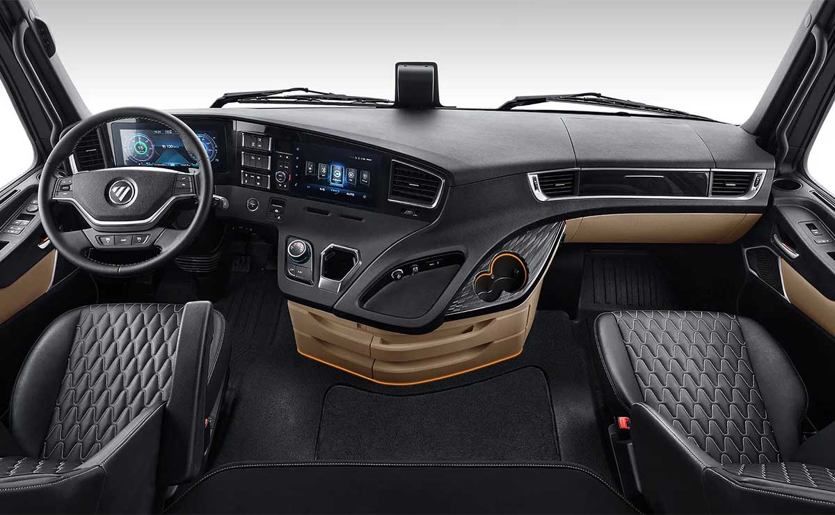 En el interior, el camión está diseñado para ser una “oficina en la carretera”, según palabras de los representantes de la compañía. El equipamiento de serie incluye una cabina dormitorio con techo alto sumamente espaciosa, sistemas de infoentretenimiento de última generación con pantalla de 10”, panel de instrumentos 100% digital y configurable, y avanzados sistemas de asistencia al conductor (ADAS), como frenado autónomo o asistentes de mantenimiento de carril, frenos a disco en todos los ejes y suspensión neumática en el eje tractivo.