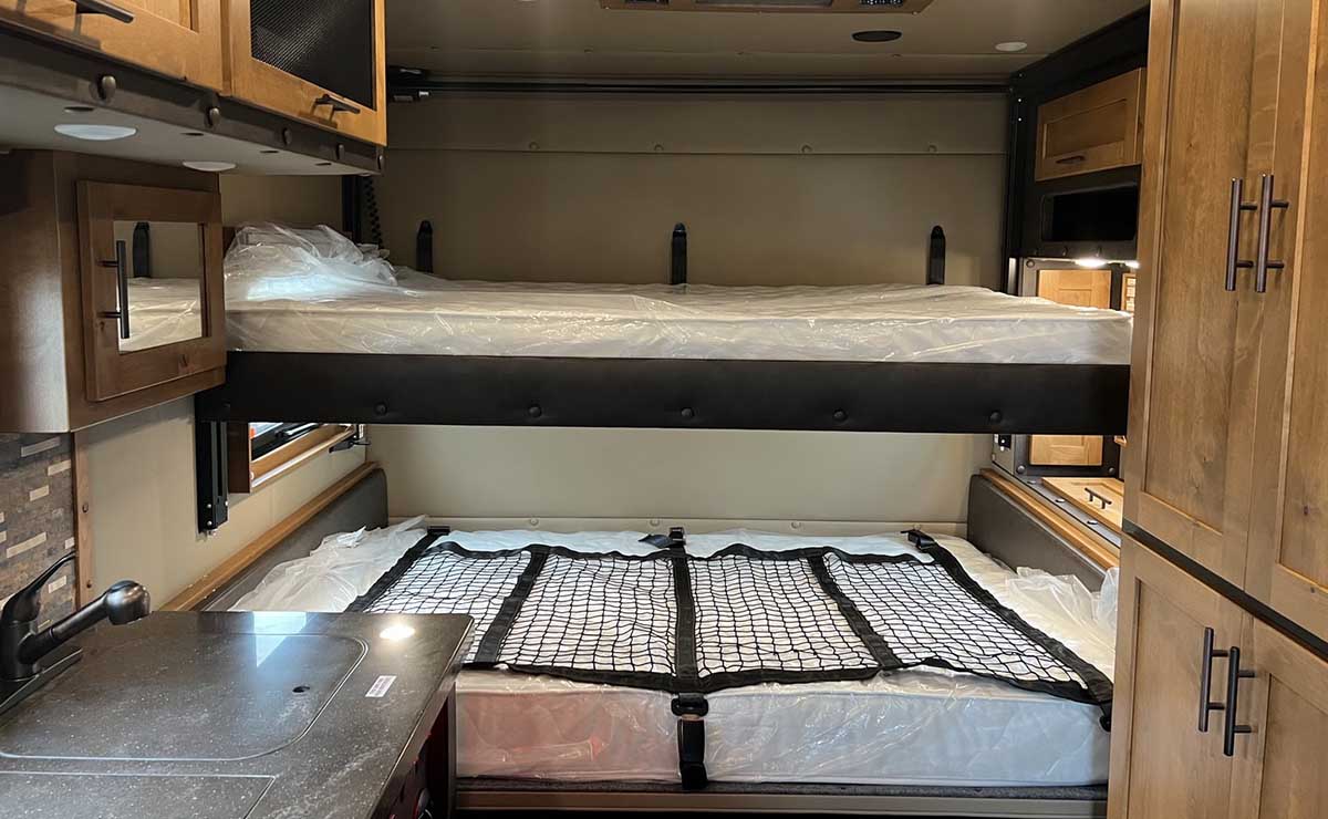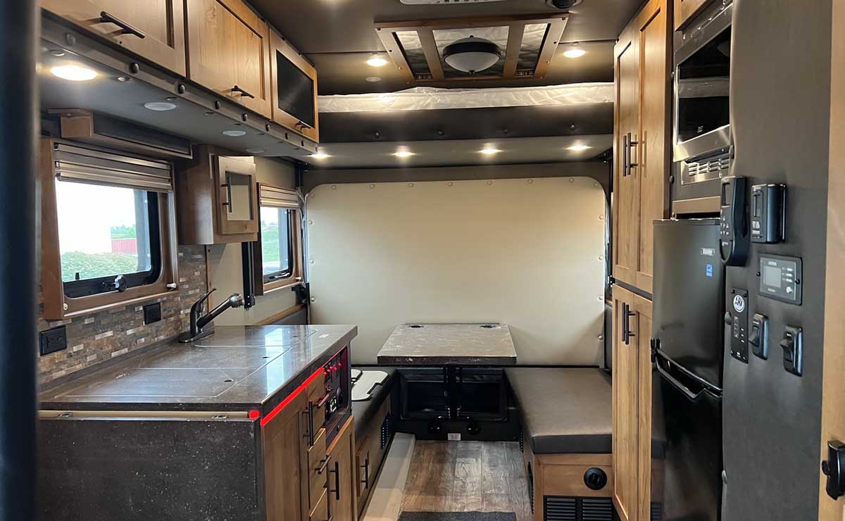 Lo que es particularmente interesante de este Peterbilt es lo que sucede en la parte trasera. La sección de dormitorio de 168 pulgadas (unos 4,26 metros) cuenta con una cocina totalmente equipada con mesada, un baño más amplio que lo normal y un dormitorio con literas dobles.