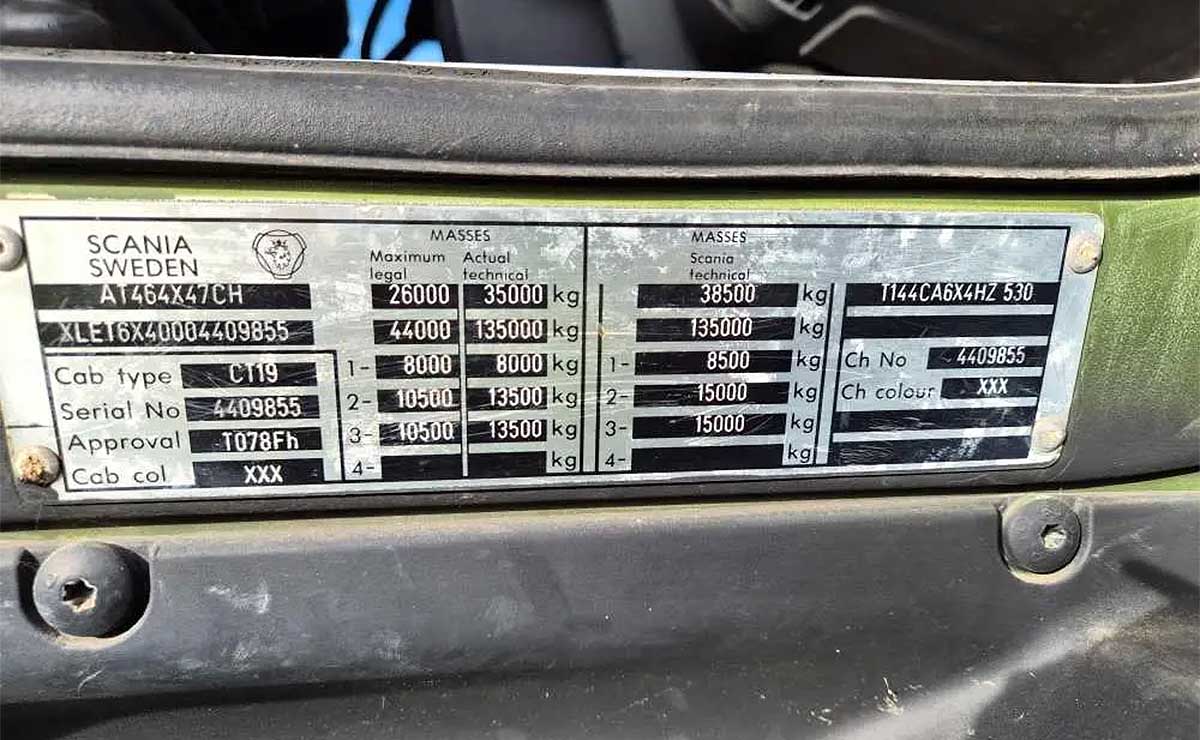 El protagonista de esta subasta es un Scania V8 T144C 530, un camión tractor preparado para tracción pesada, versión militar (letra “C” indica chasis reforzado y mayor capacidad off road). En el corazón de esta máquina late un motor V8 de 14 litros y 530 caballos, una de las configuraciones más potentes que Scania ofreció antes de pasar a la gama Euro 3 a principios del nuevo milenio.