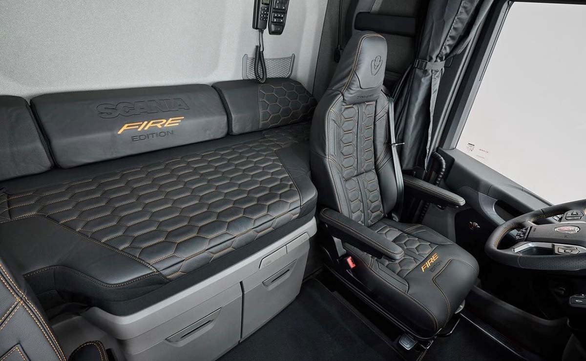 Es por eso que puertas adentro, además de la nueva plancha, la cabina ganó asientos con diseño inspirado en el panal de abeja, un motivo que se encuentra a menudo en los autos deportivos. La litera y las almohadas originales recibieron el mismo tratado. Todo en cuero de primera calidad. Además, este Scania V8 530 S Fire Edition se distingue por las alfombras decorativas y las costuras amarillas en todo el aro del volante.