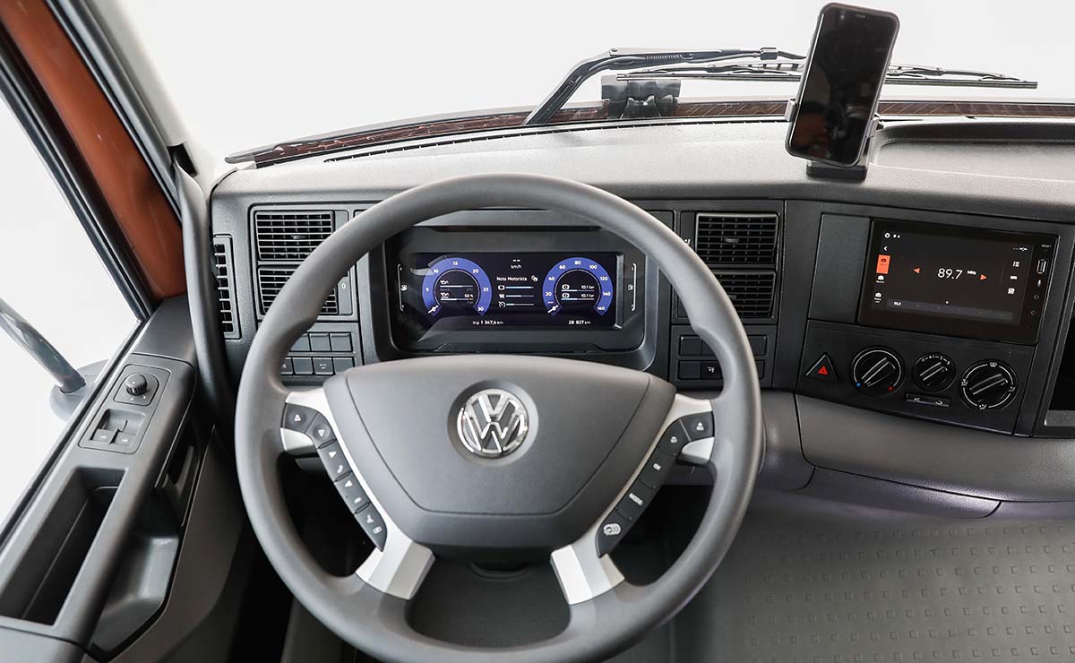 El interior también recibió mejoras, como el nuevo asiento neumático con cinturón integrado, volante multifuncional y diversos ajustes para el perfil de cada conductor. También cuenta con el panel digital más moderno de la familia Volkswagen Constellation y centro multimedia opcional, reuniendo las ventajas de los paquetes Prime y Highline.