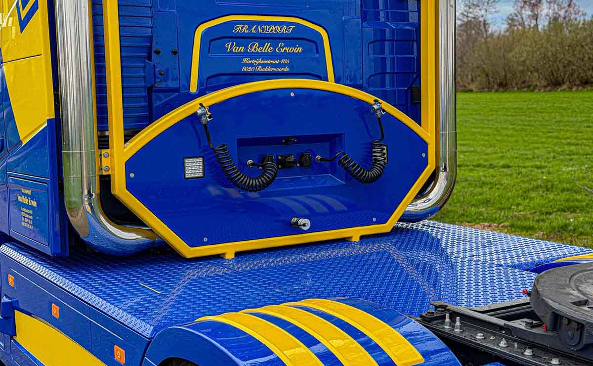 Dentro de esta gama de camiones tan especial, la unidad desarrollada para la empresa belga Van Belle Erwin lleva el concepto más lejos de lo normal. A diferencia de otras versiones más modernas personalizadas, este Volvo VT5 adopta una cabina de techo bajo, reforzando claramente su estética clásica.