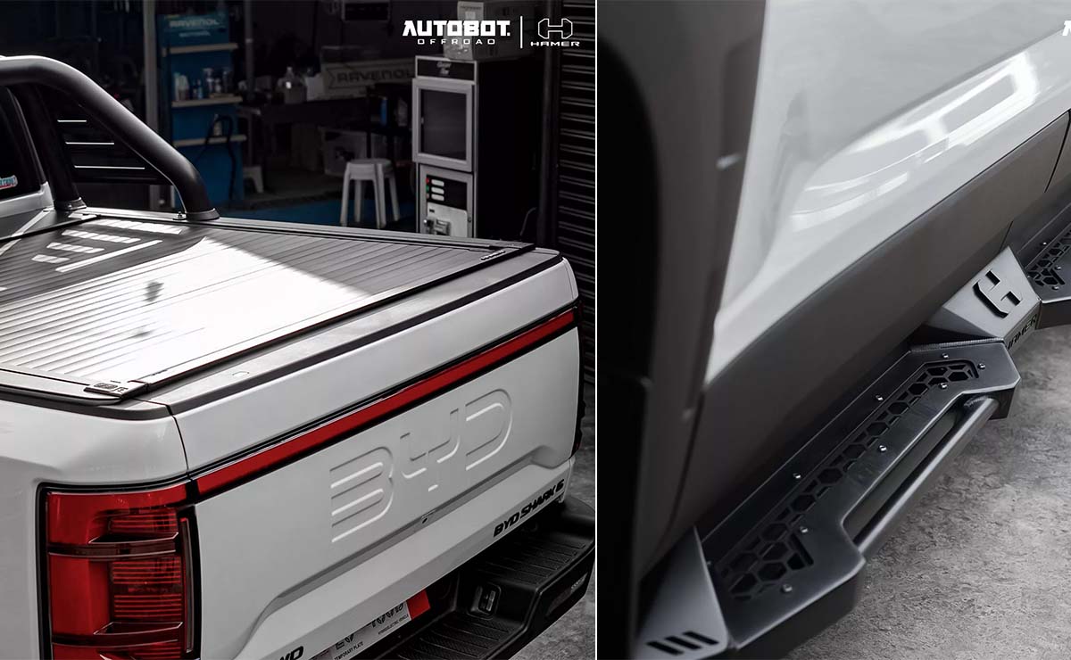 Ya en la parte trasera, opcionales como cubiertas enrollables para la caja de carga suman utilidad para quienes cargan equipo de expedición o herramientas, sin sacrificar estilo ni practicidad. Con estos accesorios la BYD Shark preparada por Hamer cambia el chip: deja de ser una híbrida elegante y se transforma en una pick up lista para aventura, aunque todavía con la suavidad oculta bajo el capó.