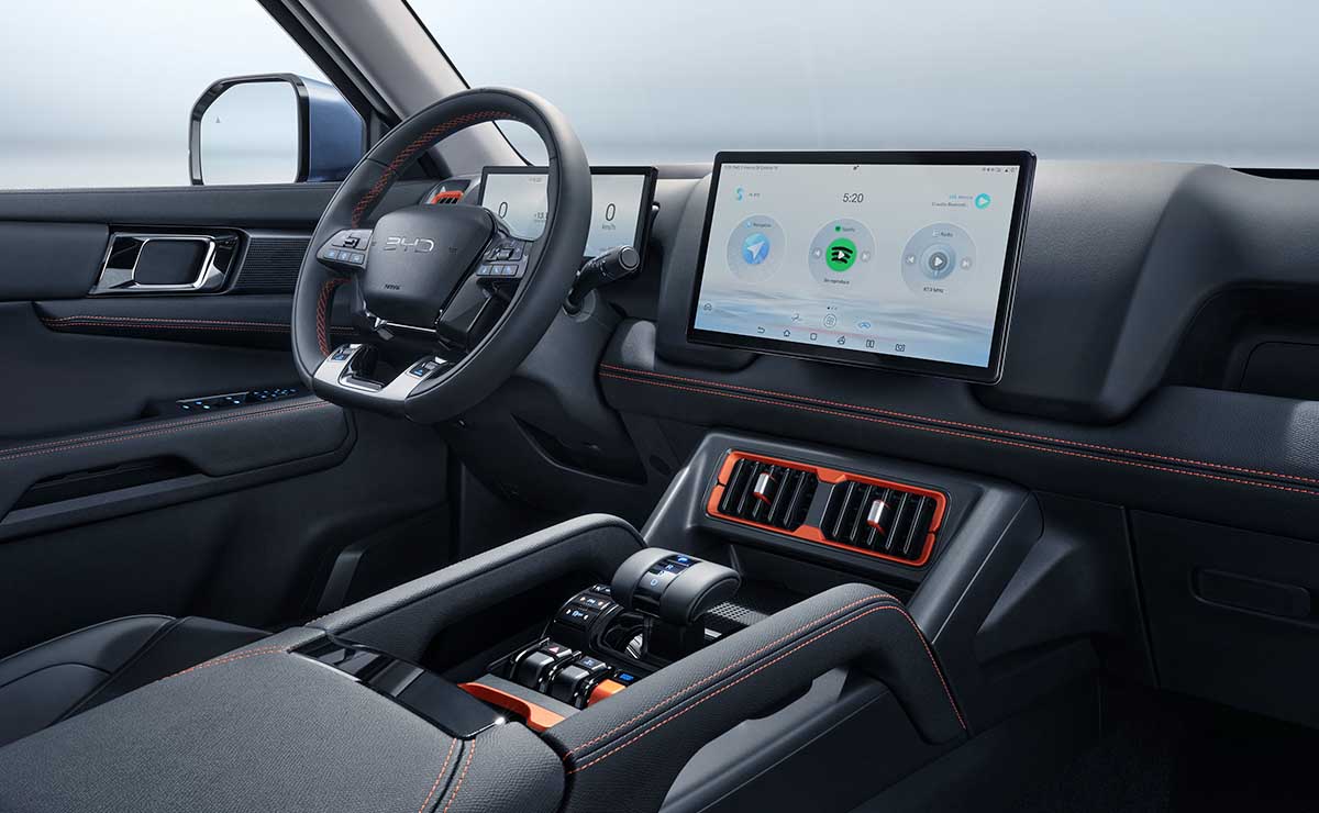 En el habitáculo, y con un diseño fiel al estilo de BYD, la plancha de a bordo presenta una curiosa disposición pero todo parece estar al alcance de conductor y acompañante. La consola central baja agrupa varios comandos y el selector de cambios, mientras que por encima la protagonista es una enorme pantalla de 13” que será prácticamente el centro de control para todas las funciones relacionadas con el sistema multimedia y la climatización ya que carece de teclas físicas. ¿El instrumental? Otra pantalla de 10”.