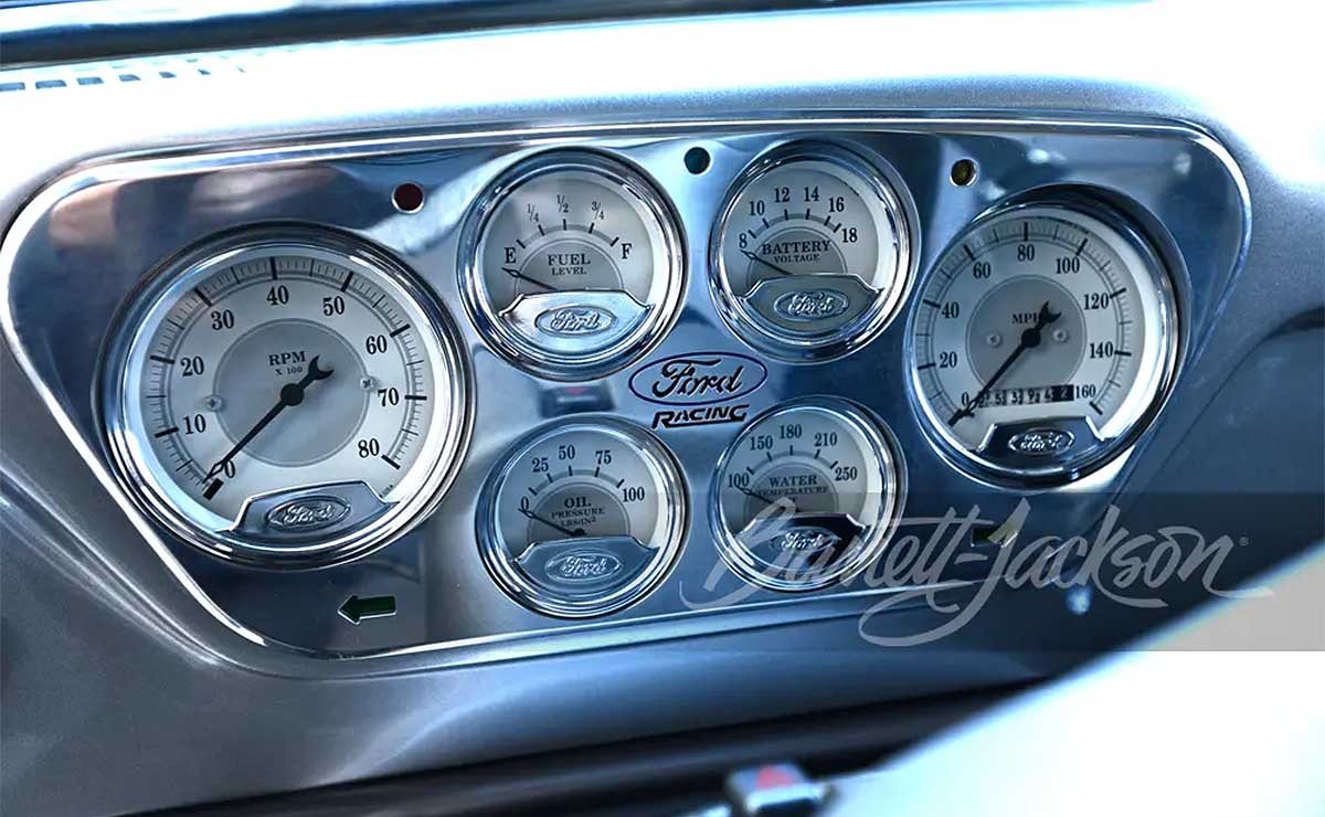 Dentro de la cabina, la historia continúa. Una jaula antivuelco suma rigidez estructural, mientras que los indicadores Ford Racing mantienen al conductor bien informado. Un volante de Mustang, pedales oscilantes Kugel y sistema de climatización Vintage Air.